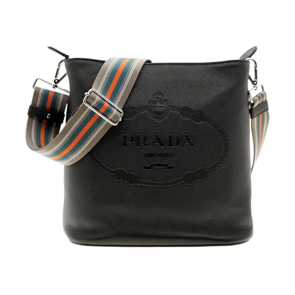 Prada Womens Black Leather Stripe Strap Bucket Bag
